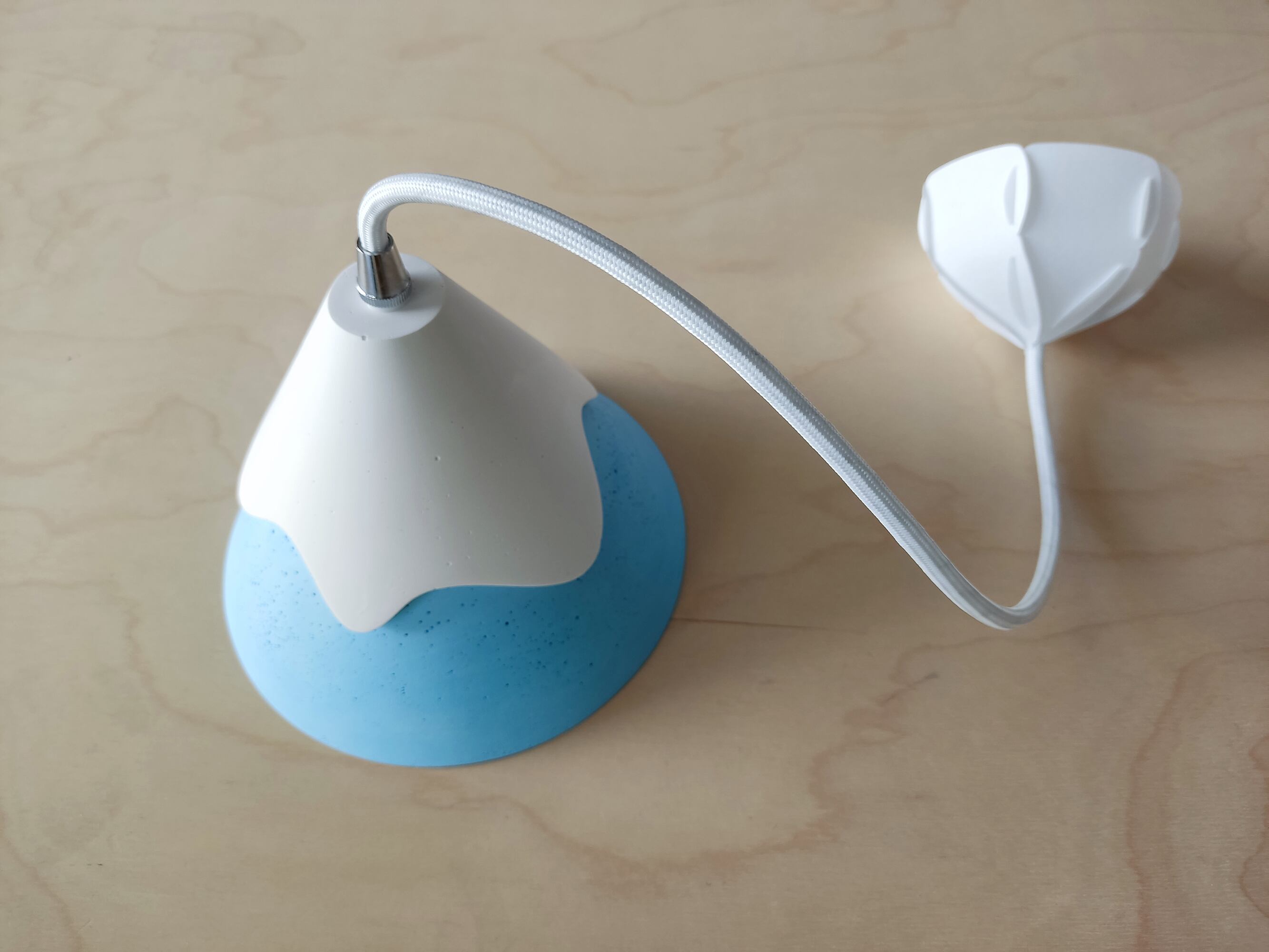 雪山と冬空に着想を得た、ホワイトとブルーの美しいコントラストが特徴のミニマルな円錐形ランプ。ベース部分に見られる濃いブルーの斑点は、岩肌や夕暮れの星空のような自然の趣を添えています。すべて手作業で仕上げられた、唯一無二の一点ものです。